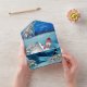 A Blue winter fantasy scene with a Geometric gold frame with freshly fallen snow in a winter wonderland design is easy to customise with your wording for the wedding couple.