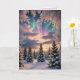 Snowy winter forest, ice crystals, northern lights card