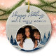 Snowy Winter Forest Snowflakes Holiday Photo Ceramic Ornament. Winter snowy forest landscape and snowflakes. Custom photo is in a round frame. Add your photo, text and year.