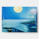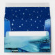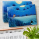 A teal & dark blue snowy star background with a snowman and a flying Santa on his sleigh sending reindeer through the sky fantasy scene.