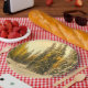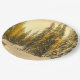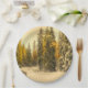 Paper plates with a beautiful nature photograph. An isolated winter path with tall snow covered pine trees.