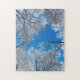 Looking up at a beautiful blue sky framed by snow covered tree branches.