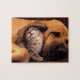 Game puzzle shown with a photo print of a cute kitten and dog being snuggle pals. Customise this item or buy as is.  Stock Image