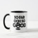 So Far Ooh So Good Happy Mug. The art displays a bold black inline font with a happy face designed as part of the word "good". Show off you're positive progress to others by sipping your best-loved hot beverage from this mug showing the cheerful So Far Ooh So Good print on both sides. Makes an excellent gift for family or friends. Thank you for the support and visiting my store - UniquelyDistinct. Feel free to transfer this design on other Zazzle products.