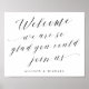 Simple Elegant Calligraphy Script Wedding Welcome Sign We are so glad you could join us in beautiful flowing fancy letters and your personalised names. A stylish yet simple formal design in black and white or any background colour you choose. Just click the customise further link, shown under the text personalisation area on the right, and choose your custom colour background. This sign poster template makes it fast and easy to create stunning additions to your wedding decor. Signs can be enlarged, there are many sizes to choose from, as well as options for custom framing and matting. Welcome wedding custom signage.
