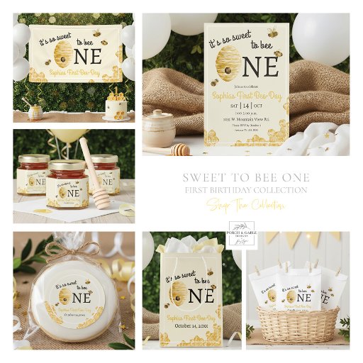 Make your little one’s first birthday even sweeter with this It’s So Sweet to Bee One party banner from Porch and Gable Design. Featuring charming watercolor bees, honeycomb details, and a soft buttercream yellow background framed in white, this cheerful design adds the perfect finishing touch to your bee-themed celebration.