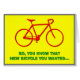 This silly cycling-themed birthday card features the message "SO, YOU KNOW THAT NEW BICYCLE YOU WANTED..." on the front, along with a red silhouette representation of a bicycle. The inside features the joking message, "I really hope that someone else bought it for you. Happy Birthday!" This might be a fun birthday card to use when celebrating a cyclist's birthday.