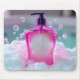 Vibrant soap bubbles and frothy foam surround a pink liquid soap dispenser with a black pump