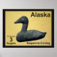 A postage stamp from a mythical independent Alaska featuring a soapstone carving of an Eider Duck. The background is brain tanned moose hide. This is a digital rendering, not an actual soapstone object. The Common Eider, Somateria mollissima, is the largest duck found in Europe and in North America (except for the Muscovy Duck which only reaches North America in a wild state in southernmost Texas) The Eider is distributed over the northern coasts of Europe, North America and eastern Siberia. It breeds in Arctic and some northern temperate regions, but winters somewhat farther south in temperate zones, when it can form large flocks on coastal waters. It can fly at speeds up to 70 mph (113 km). The Eider is chraacterised by its bulky shape and large, wedge-shaped bill. The male is unmistakable, with its black and white plumage and green nape. The female is a brown bird, but can still be readily distinguished from all ducks, except other eider species, on the basis of size and head shape. This duck's call is a pleasant "ah-ooo." The species is often readily approachable. Drakes of the European, eastern North American and Asia/western North American races can be distinguished by minor differences in plumage and bill colour. This species dives for crustaceans and molluscs, with mussels being a favored food. The Eider will eat mussels by swallowing them whole; the shells are then crushed in their stomachs and excreted. When eating a crab the Eider will remove all of its claws and legs and then eat the body in a similar fashion. It is abundant, with populations of about 1.5-2 million birds in both North America and Europe, and also large but unknown numbers in eastern Siberia. A particularly famous colony of eiders lives on the Farne Islands in Northumberland, England. These birds were the subject of one of the first ever bird protection laws, established by Saint Cuthbert in the year 676. About 1,000 pairs still nest there every year. Because St. Cuthbert is the patron saint of Northumberland, it was natural that the eider should be chosen as the county's emblem bird; the birds are still often called Cuddy's ducks in the area, "Cuddy" being the familiar form of "Cuthbert". The Common Eider is one of the species to which the Agreement on the Conservation of African-Eurasian Migratory Waterbirds (AEWA) applies. Eiders are colonial breeders. They nest on coastal islands in colonies ranging in size of less than 100 to upwards of 10,000-15,000 individuals. Female eiders frequently exhibit a high degree of natal philopatry, where they return to breed on the same island where they were hatched. This can lead to a high degree of relatedness between individuals nesting on the same island, as well as the development of kin-based female social structures. This relatedness has likely played a role in the evolution of co-operative breeding behaviours amongst eiders. Examples of these behaviours include laying eggs in the nests of related individuals and crèching, where female eiders team up and share the work of rearing ducklings. The eider's nest is built close to the sea and is lined with the celebrated eiderdown, plucked from the female's breast. This soft and warm lining has long been harvested for filling pillows and quilts, but in more recent years has been largely replaced by down from domestic farm-geese and synthetic alternatives. Although eiderdown pillows or quilts are now a rarity, eiderdown harvesting continues and is sustainable, as it can be done after the ducklings leave the nest with no harm to the birds.