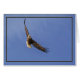 An adult bald eagle in a sharp turn highlighted by a blue sky.