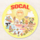 A cartoon of Southern California – showcasing Los Angeles, Anaheim, Long Beach, San Diego. Cartoon characters of all sorts swim and splash and play beneath the bright California sun shining high above it all.