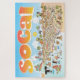 Bright and detailed whimsical vision of Southern California - featuring Los Angeles and San Diego and Orange County plus many major cities and most beach towns - zany characters play on the beach and desert, mountains and valleys. This charming scene has it all – a surfer hangs ten while a mermaid lounges on a rock, a killer whale leaps out of the water as a t-rex roars a challenge, a muscular beach couple both flex to impress, zoo animals wait for tourists and a bull smashes into a bull fighter…
