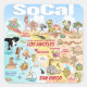 Bright and funny scene - a map view of Southern California - charming characters enjoy the SoCal sun - Los Angeles, San Diego, Anaheim, Santa Barbara, Riverside, Palm Springs and El Centro are featured - Anza Borrego Desert State Park and Joshua Tree National Park are included as well as the border cities of Tijuana, Tecate and Calexico in Mexico.