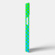 Custom soccer fan iPhone case, with graphics of a blue and green dot pattern background. Graphics of a soccer ball decorates the bottom right corner of the case and custom black text, on the bottom, is ready to personalize. Great phone case for the sports fan or soccer player.