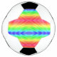 "Soccer ball featuring a vibrant rainbow geometric pattern on white panels, with contrasting black pentagons. Below is the pattern displayed flat."