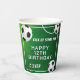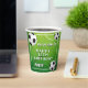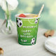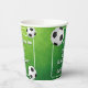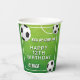 Soccer Ball Football Sports Kids Birthday Party Paper Cups. The design has a fun text "Kick up some fun" and soccer balls on a green background. Personalise with your age and name.
