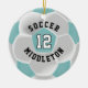 Soccer Ball Ornament featured in Teal and White design with diy name and number. A great gift for any soccer player. ⭐This Product is 100% Customisable. Graphics and / or text can be added, deleted, moved, resized, changed around, rotated, etc... 99% of my designs in my store are done in layers. This makes it easy for you to resize and move the graphics and text around so that it will fit each product perfectly. 📌 (Please be sure to resize, change, add, delete or move any graphics or text if needed before ordering) You can also "TRANSFER DESIGN" on other Zazzle products and adjust the design to fit most of Zazzle items. (button is down on the right side of the page) Some of the text graphics have ready to fill in the box(es) or you can Click on the "CUSTOMIZE" button to add, move, delete, resize, background colour or change any of the font or graphics. The design is made with high resolution vector and/or digital graphics for a professional print. 📌NOTE: (THIS IS A PRINT. All Zazzle product designs are "prints" unless otherwise stated under "About This Product" area) The design will be printed EXACTLY like you see it on the screen and on the product...so please make sure when you do your changes on the resizing of any of the graphics or text that it fits in the areas correctly and that your spelling and wording is how you like it to be in size, colour and font. If you have any questions about the "DESIGN ONLY" or need help please contact ME DIRECTLY at my store link: https://www.zazzle.com/store/LetsUDesignIt (Copy and Paste) I'll be happy to help. ⭐ ALL OTHER QUESTIONS SUCH AS (shipping, refund, the printing being incorrect, the product itself, etc...) please contact Zazzle or the Maker ⭐DIRECTLY⭐. Thank you for the support and stopping by my store - LetsUDesignIt. ⭐⭐⭐ ZAZZLE promises 100% satisfaction.