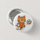 Round pinback button featuring an orange cat kicking a soccer ball with an intense expression. A fun sporty button for backpacks, jackets, or casual wear.