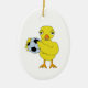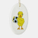 A yellow chick holding a soccer ball is a humourous sport design for back to school, birthdays and holidays.