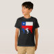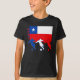 Three soccer players play in front of the Chilean flag. Country name Chile is on the side
