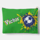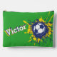 Bright yellow and dark blue football / soccer ball splatting in the back of the goal / net kids pencil case or accessory pouch. Ideal for football or soccer fans, personalise with your own name and choice of background colour currently green. Name on the case reads VIctor or change it to your own. Other matching items are available. Designed by Sarah Trett. www.sarahtrett.com for www.mylittleeden.com