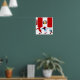 Three soccer players play in front of the Peruvian flag. Country name Peru is on the side