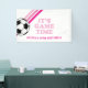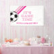 It's Game Time! Soccer Birthday banner with pink stripes and soccer ball.