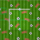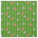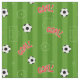 Fun fabric printed with a pattern of soccer footballs, green stripes, white pitch markings, and the word GOAL!
