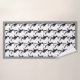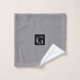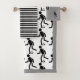 Soccer player with ball, stripes, grey border and monogram bathroom towel set. It showcases a black silhouette of a soccer player ready to kick his ball on white background with a grey border. The hand towel features black, grey and white stripes and the wash cloth is of grey colour with your monogram and the player.