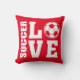 Red SOCCER LOVE Soccer players cushion. Soccer players will love this comfy Soccer cushion! This Soccer cushion has a Love theme with the words SOCCER and LOVE in bold white letters. A soccer ball serves for the letter O giving this design a real soccer theme. On the back of this cushion is the same Soccer Love design but printed as a fantastic all over patterned print. This comfy cushion looks great on any chair and will show everyone you have a ardent love for Soccer. More fun soccer themed gifts and merchandize available in the STAND UP AND CHEER store!