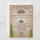 A baby shower by mail invitation featuring an illustration of a baby bear lounging on a tree branch surrounded by stars with original poem. Bear is wearing a flower crown. Mountain illustration and trees at bottom. Personalise the text. Background is cardstock inspired.
