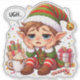 Funny Christmas elf representing holiday burnout humour. A relatable festive design perfect for holiday stickers and apparel.