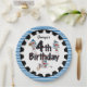 Sock Monkey Baseball 4th Birthday paper plates, a cute design that's great for kids who love sports, especially baseball, and cute monkeys! Features three sock monkey baseball players in baseball caps, one sliding into home plate, one up at bat, one getting ready to pitch the ball! Black polka dotted text reads 4th Birthday and there's a border of blue and white stripes and a black decorative ring. You can easily customise these sock monkey baseball 4th birthday paper plates with a name!