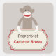 Sock monkey design,  customised sticker,  perfect for use as a bookplate or to personalise school supplies.