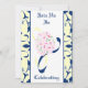 This wedding invitation card is decorated with a Bride's bouquet superimposed on a white background and the words "Join Us in Celebrating" bracketed with Sodalite Blue and Lemon damask bars.