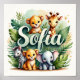 Beautiful nursery decor featuring charming baby safari animals and tropical leaves with the name Sofia prominently displayed. Creates a warm, adventurous atmosphere perfect for any child's room. High-quality print ready for framing. Custom names available - message me for details!