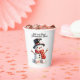 A fun winter season design featuring a little round snowman made of melting marshmallows. Gooey marshmallows puddled around him with soft pink centres. He wears a top hat and polka dot scarf. The message says 'soft and sweet, marshmallow treat. Picture these paper cups full of mini marshmallows for the children to enjoy during the holidays.