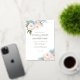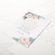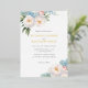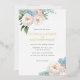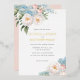 Elegant botanical themed wedding invitation with a decoration of soft blue and pink flowers and elegant green foliage at the corners.