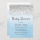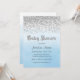 Baby shower invitation with faux silver glitter design and ombre blue watercolor background.