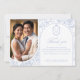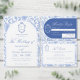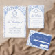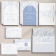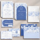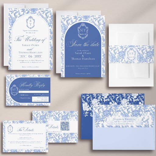 Soft delft blue floral wedding invitation card, designed in a refined blend of chinoiserie and French toile de Jouy style. The soft botanical illustrations frame an arched layout featuring an elegant wedding crest monogram, perfect for couples who love vintage, historic, and European-inspired aesthetics. Classic script typography pairs beautifully with the ceramic-blue palette, making this design an effortless nod to the tradition of “something blue.” Fully customizable with your names, date, and location, it’s an exquisite choice for any romantic or sophisticated wedding theme.