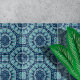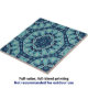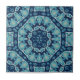 This ceramic tile features a mesmerising mosaic geometric design. The intricate patterns and symmetrical shapes converge to create a visually striking centerpiece. The tile is adorned with various shades of blue, ranging from deep navy to soft turquoise. These colours are artfully arranged to enhance the depth and dimension of the design. The kaleidoscopic arrangement of the tile gives it a dynamic and modern aesthetic. Despite its contemporary appeal, it retains an air of classic elegance, making it a versatile piece that could complement a variety of decor styles. The complexity of the design draws the eye towards the centre, inviting viewers to lose themselves in the labyrinth of shapes and colours.