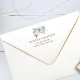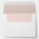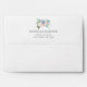 A watercolor bouquet of white and ivory roses, pink and blue flowers with delicate leaves is displayed over the return address and solid blush pink colour decorates the inside of this elegant white envelopes adding a chic botanical twits.