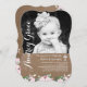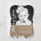 This Baptism Invitation photo card features an elegant layout of soft pink peonies, a lace cross, burlap background, and your child's name in a pretty script font.