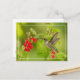 A sweet hummingbird hovers before bright red salvia blossoms against a soft green background.