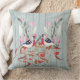 The background of this design is a wooden fence or barn effect in a soft teal grey colour. Over this are sprigs of heart shaped flowers and leaves in shades of pink, red, teal and brown with a pair of pretty birds in watercolor. The reverse of this large grey throw pillow is just the wood effect.
