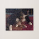 On this Jigsaw Puzzle, soft kitty paws are the first thing you see in this original photograph by ZoeSPEAK of a calico cat. The mostly black and brown cat is lying on a dark red and brown blanket against a dark background, and her white paws stand out, spread out in front of her with the centre two crossed over each other. The white fur on her chest leads up to her face, with her eyes fixed on something across the room.