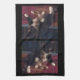 Soft kitty paws are the first thing you see in the original photograph of a calico cat on this Kitchen Towel. The mostly black and brown cat is lying on a dark red and brown blanket against a dark background, and her white paws stand out, spread out in front of her with the centre two crossed over each other. The white fur on her chest leads up to her face, with her eyes fixed on something across the room.
