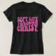 This stylish Christian t-shirt features bold, retro-inspired wavy typography with the uplifting message “Soft Life Through Christ.” The vibrant pink lettering stands out beautifully against a dark background, creating a trendy yet faith-centered design that feels modern, confident, and joyful.