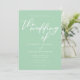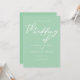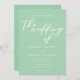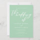 This soft mint green wedding invitation features chic white script for a sweet spring outdoor ceremony. Simple typography on a tranquil solid pastel green invite for a garden venue.