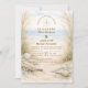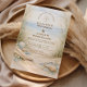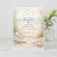 A refined coastal wedding design featuring an elegant oval wreath of seashells, oyster shells, starfish, and soft sea glass accents. Neutral sandy tones blend with muted ocean blues and delicate dune grasses to create a serene seaside aesthetic. The warm parchment background enhances the natural textures while maintaining a timeless, elevated feel. Perfect for a romantic beach celebration with classic coastal charm.